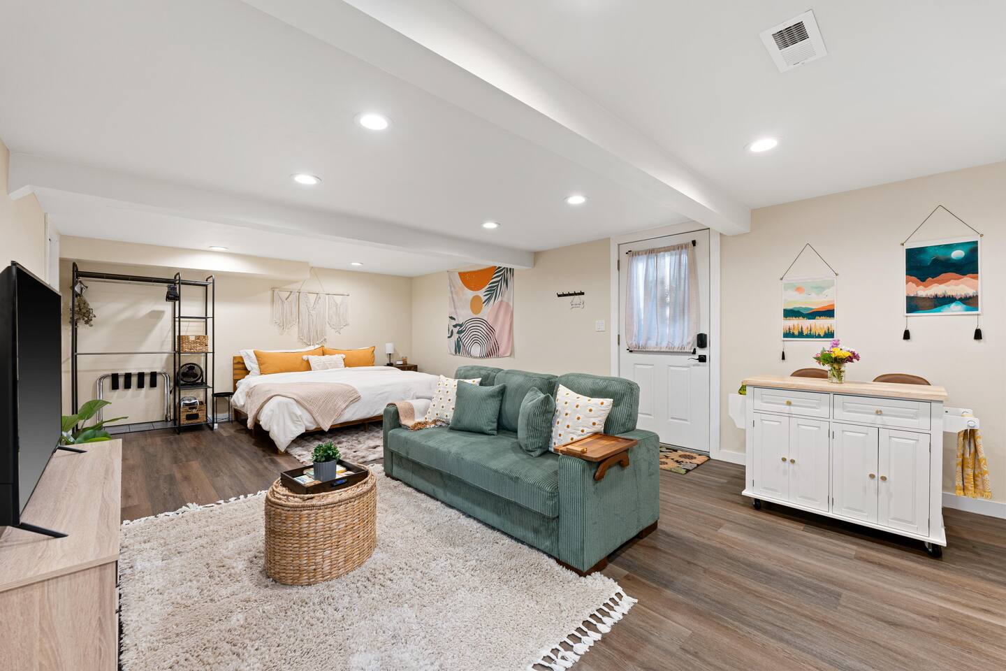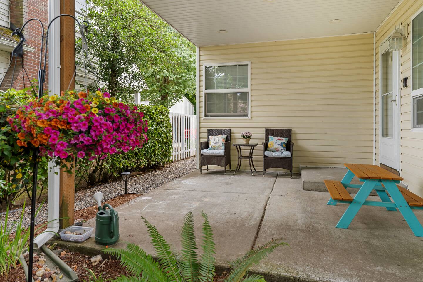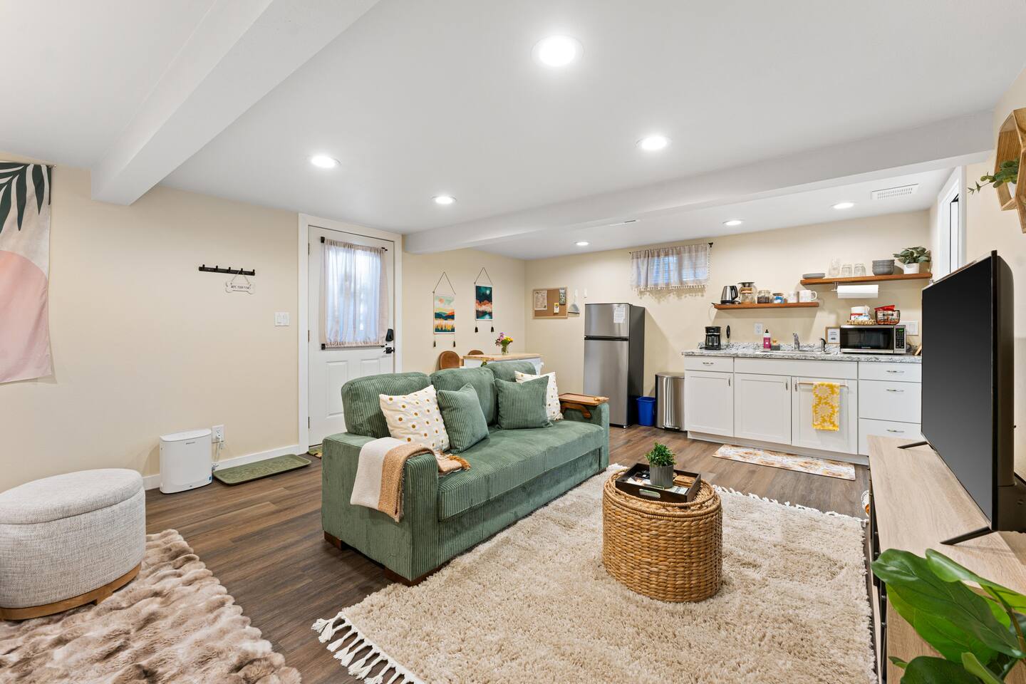 You’ll have the entire lower-level studio apartment to yourself, complete with a private entrance for easy self-check-in. Shared amenities include the laundry room (available for stays of 3+ nights and located on the same level), the fully fenced backyard, and the outdoor hot tub — available for $20 per night during fall and winter, charged only on nights you choose to use it.
