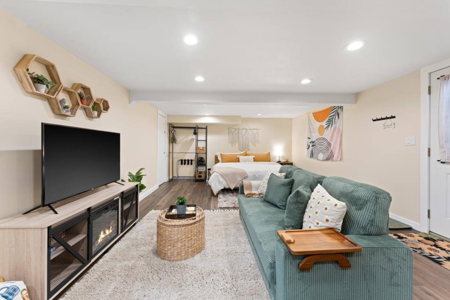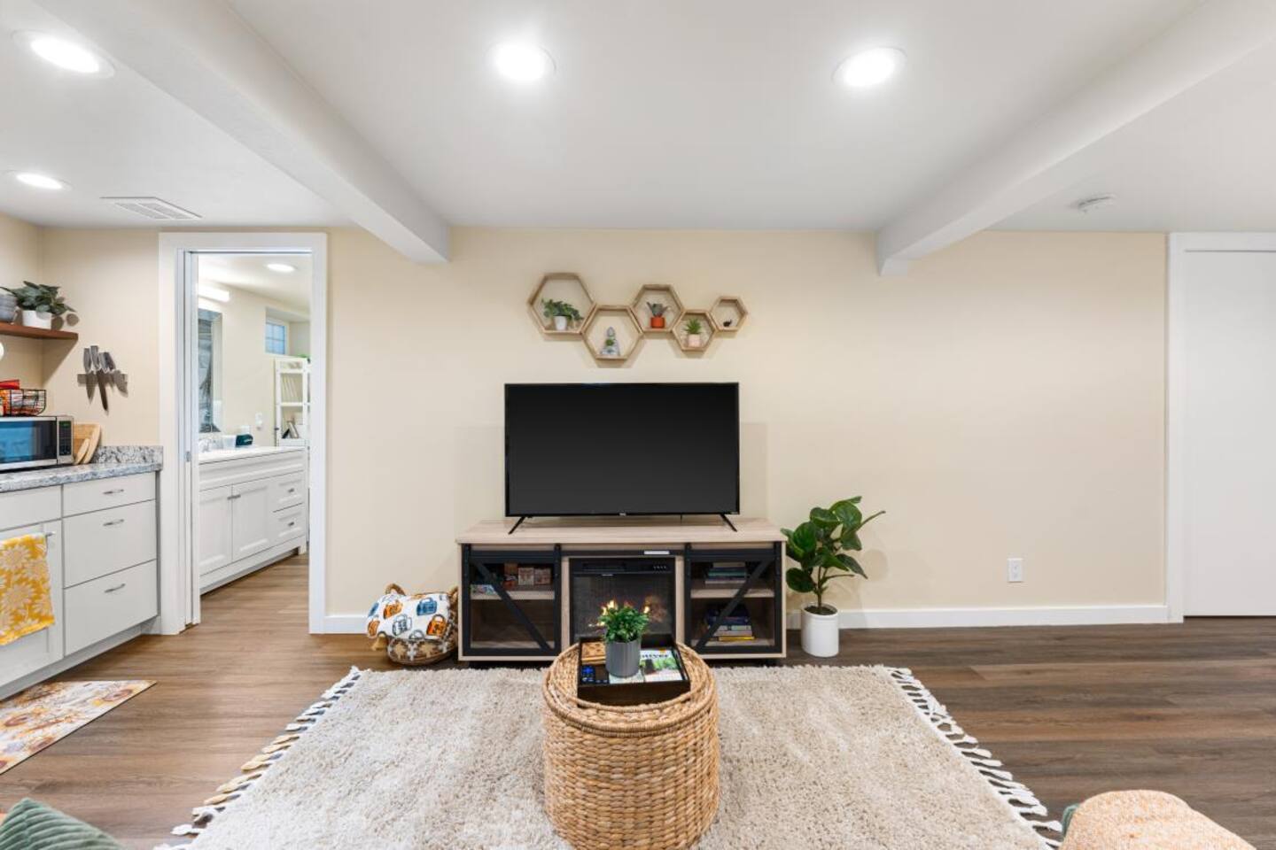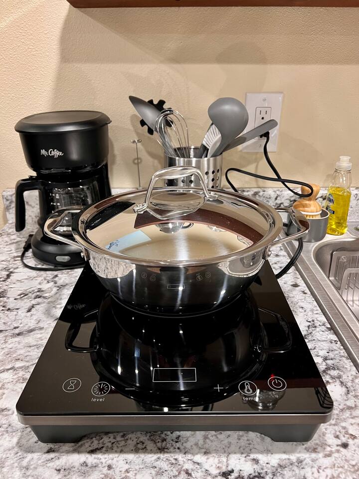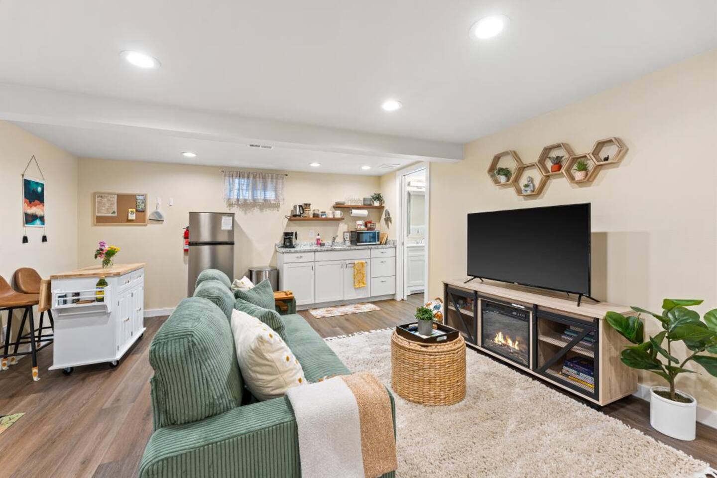 Relax in this cozy, thoughtfully designed lower-level unit with a private entrance and small luxury touches throughout. Enjoy a king-size hybrid mattress, electric fireplace, spacious modern bathroom, and a 50” Smart TV for streaming your favorite shows. The kitchenette is equipped with everything you need for a simple meal or cozy night in — including an air fryer, microwave, nearly full-sized fridge/freezer, induction cooktop, drip coffee maker, hot water kettle, and a selection of coffee, teas, and cooking essentials. Outdoor Perks (shared): ✨ Hot Tub – Enjoy private use of our hot tub, located in our shared backyard. While the space is technically shared, we don’t use the hot tub during guest stays — it’s all yours to relax and unwind. Fall & winter use has a $20/night fee, and only on the nights you choose to use it. 🔥 Fire Pit – Perfect for cool evenings under the stars 🐾 Pet-Friendly Yard – A fully enclosed outdoor space with fencing and privacy trees. Since it’s a shared area, please keep pets leashed at all times. Questions? We’re always just a message away and happy to help!